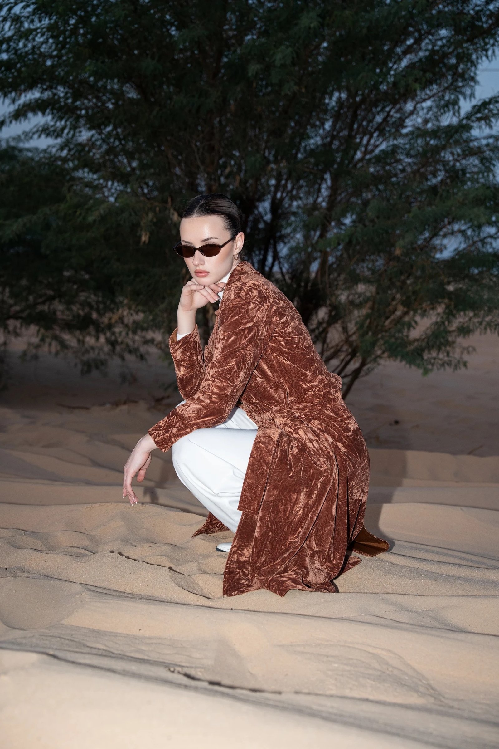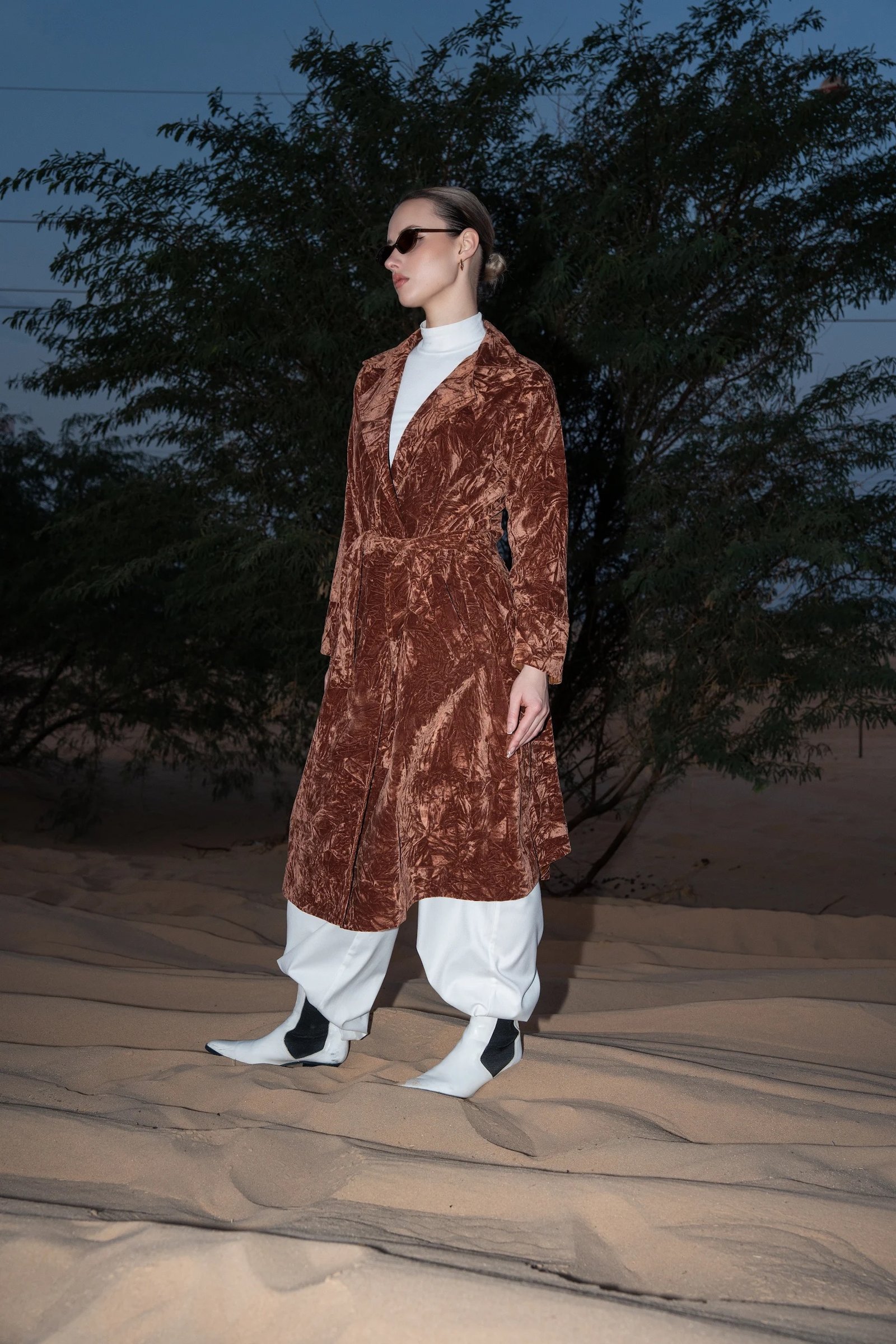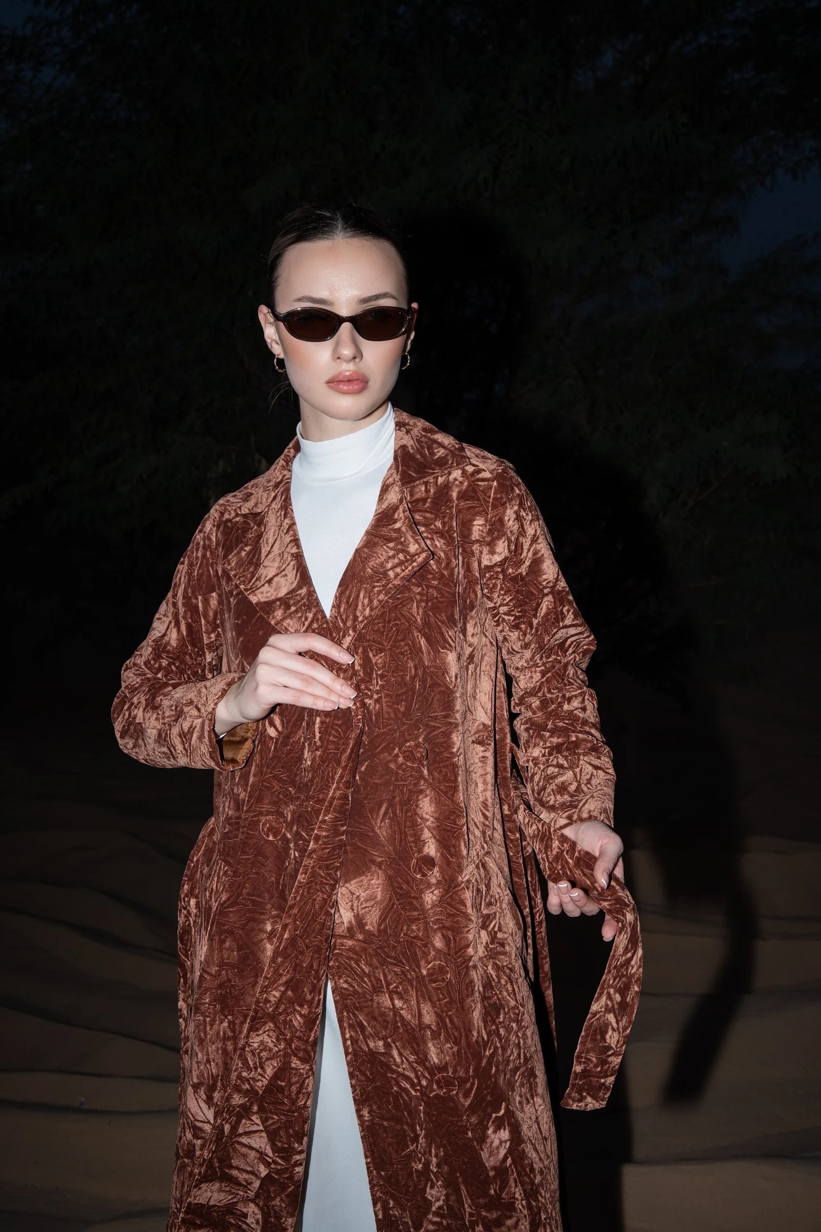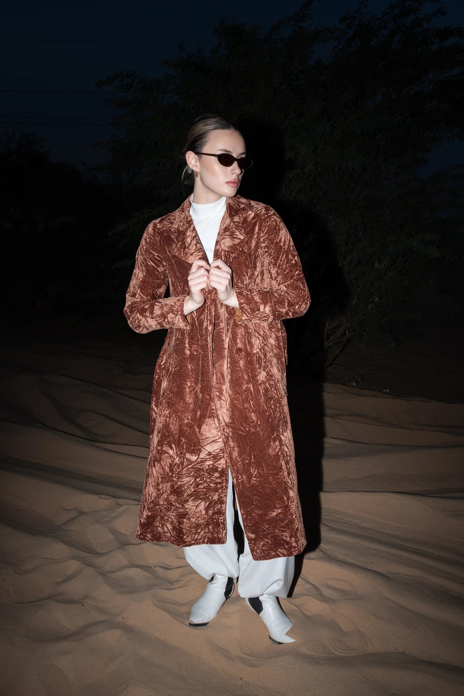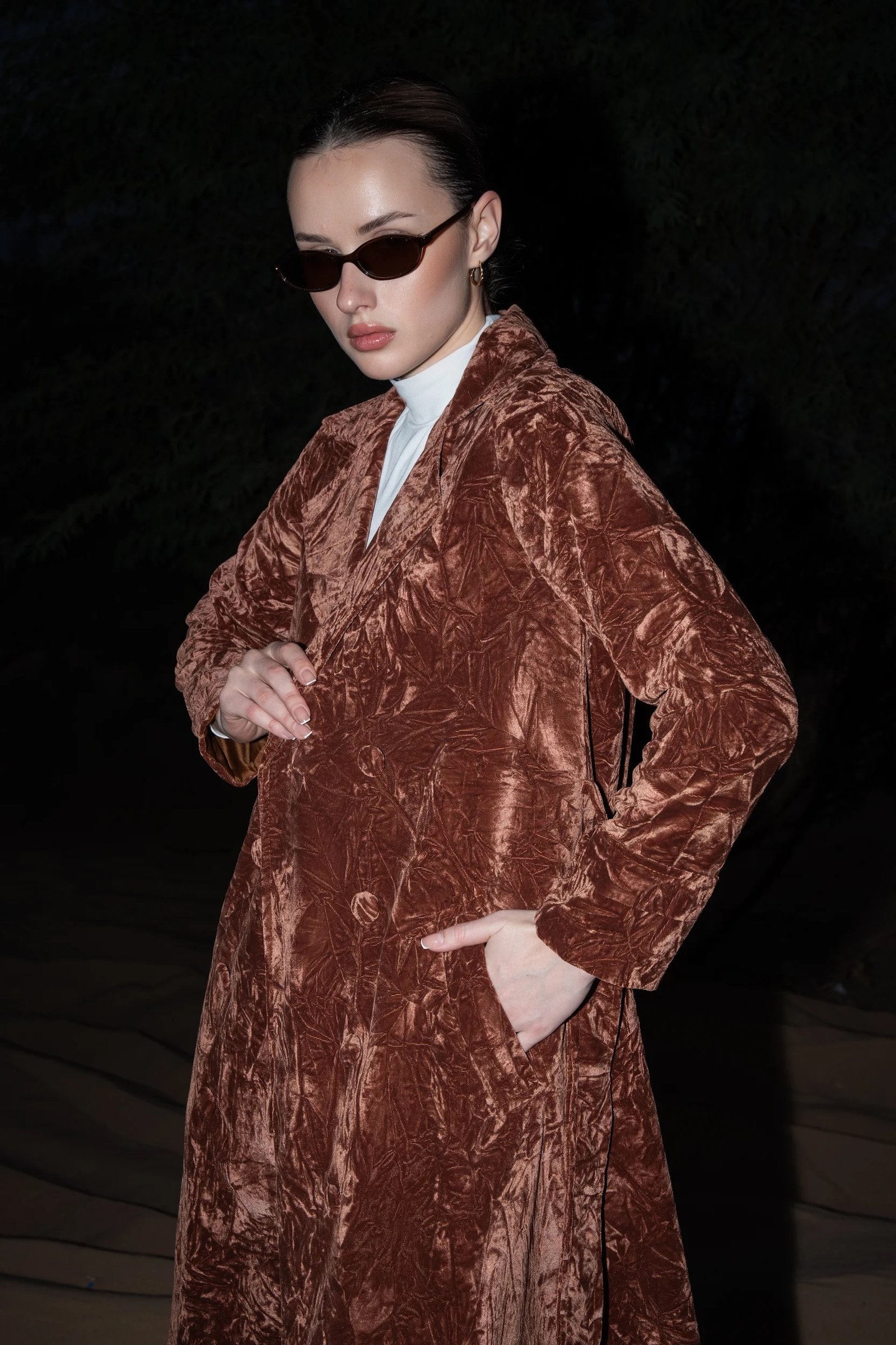 An elevated trench coat crafted from rich velvet fabric, designed for a bold yet refined statement product details: