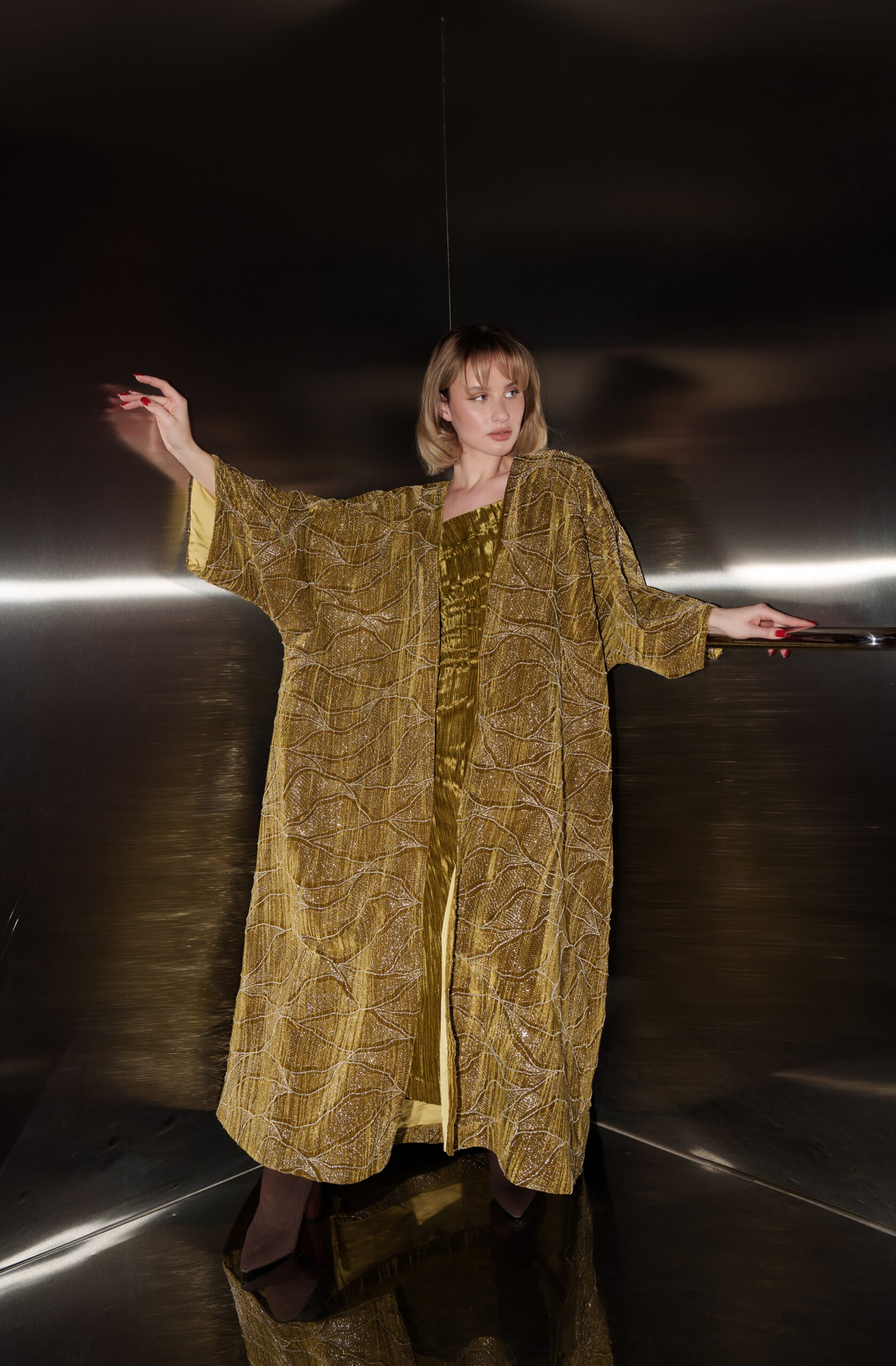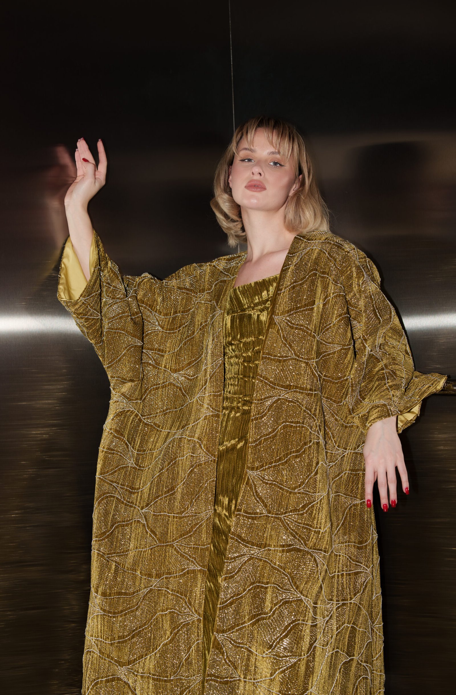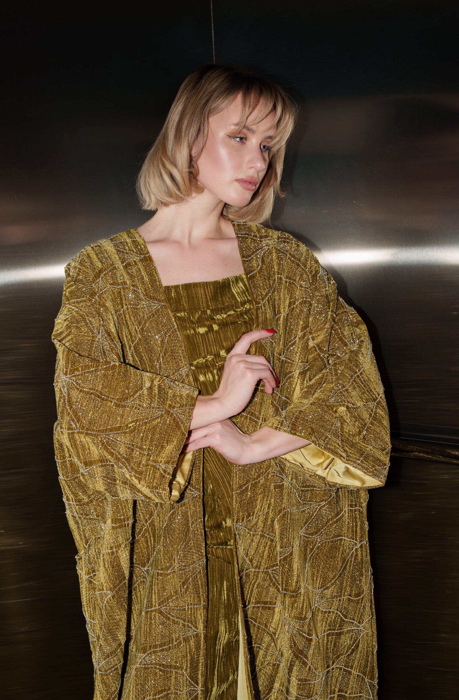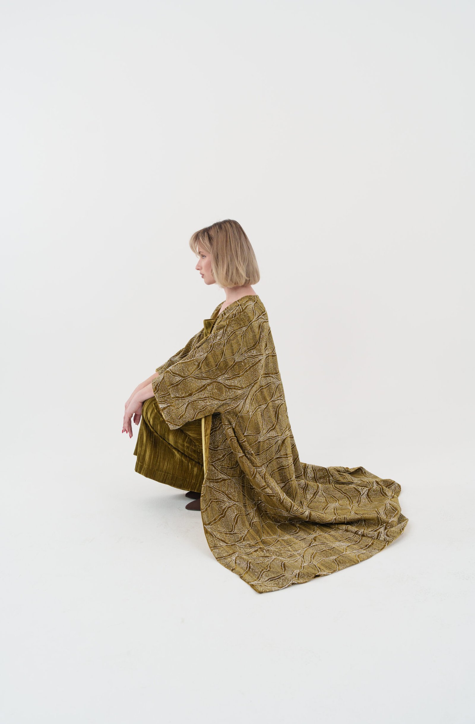 A refined olive-toned set featuring a fluid inner dress and a softly draped outer layer, designed for effortless elegance and modern sophistication.